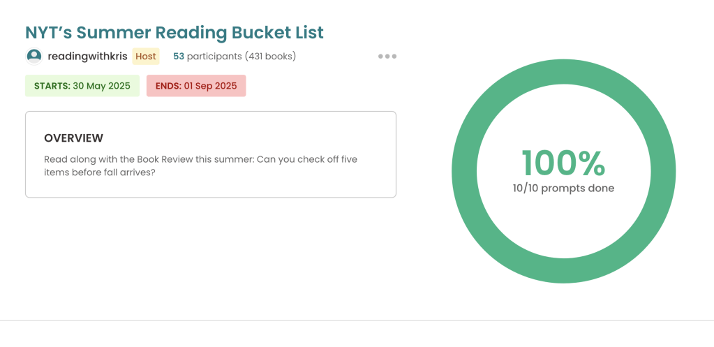 I read 40 books, including 2 short stories, 1 play, and 4 graphic novels. I finished the following Summer reading challenges: